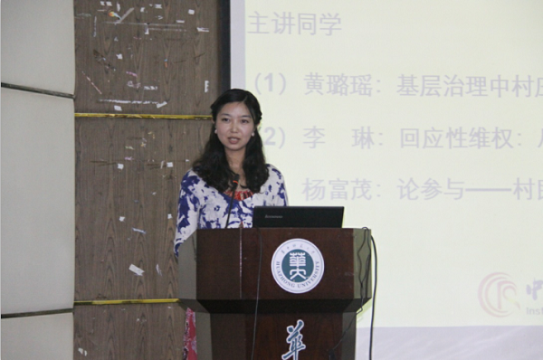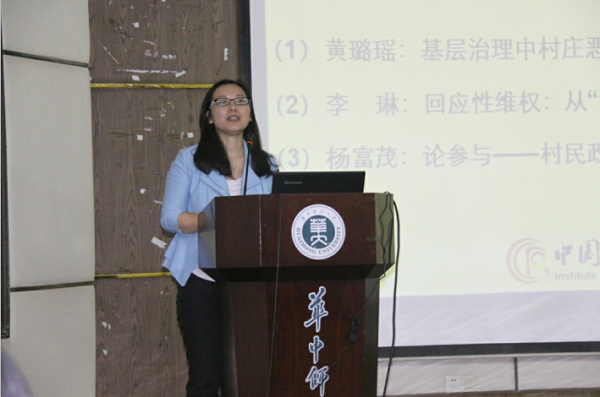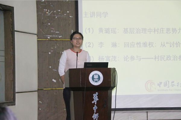 黄璐瑶同学以河南省毛庄村为例,分析了基层治理中村庄恶势力把持村务的现象与影响。李琳同学以四川省水竹林村为例,通过回顾村庄三次征地中农民、村两委与政府的维权互动,尝试建构“回应性抗争”理论来解释农民维权行为。杨富茂同学基于云南省向阳村村民政治冷漠的现状,对村民政治参与度低,话语权少的问题进行了分析探讨。
