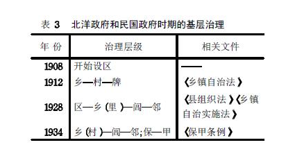 随着民族国家的建立,民国政府不仅推行县政官僚化,而且促进县级以下行政体系正规化(参见表3),主要有以下三项举措。