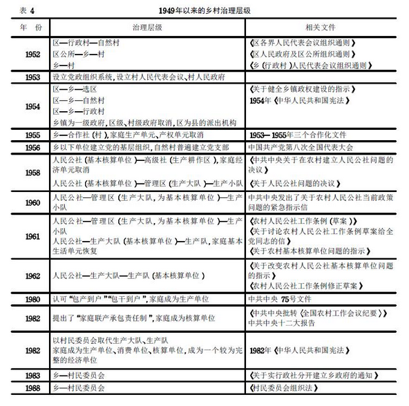 新中国成立以后,农村基层治理体系变化更大(参见表4),大体可以分为以下四个阶段。