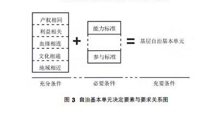 如果将“能力规模最小”和“参与规模最大”称为“两大标准”,即能力标准和参与标准,那么产权相同、利益相关、血缘相连、文化相通、地域相近则可以称为“五个要素”。“五个要素”中的某一个或者某几个可以形成共同体,但这些共同体可能比较大,也可能比较小,还需要将“两大标准”加进来考察,才能够共同确定基层自治的基本单元。可见,“五个要素”是自治基本单元的必要条件,“两大标准”是自治基本单元形成的充分条件,仅有“五个要素”只能确定为共同体,无法确定是否为自治的基本单元;仅有“两大标准”,只知道是基本单元,没有办法知道这个基本单元是如何形成的;当然没有“两大标准”根本就无法确定自治的基本单元(参见文后图3)。因此,“五个要素”和“两大标准”共同决定基层自治的基本单元,或者说农村基层自治的基本单位是“两大标准”和“五个要素”的函数。简单地说,“五个要素”确定是否是共同体,“两大标准”则确定“基本”在哪里、“基本”有多大。