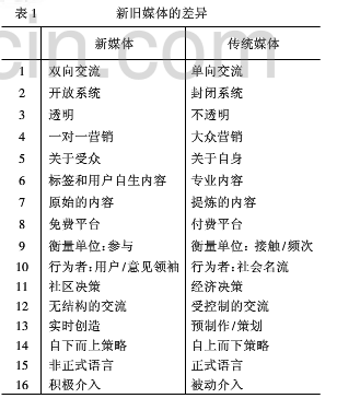 有学者详细地总结了新旧媒体之间存在的16项差异(见表1)。总的来说,新旧媒体最本质的差别是,传统媒体是“主导受众型”,而新媒体是“受众主导型”。从理念上讲,新媒体注重受众的话语权,所以采用的是“关于受众”的运营思维;而传统媒体注重的是作为信息源的权威性,所以它着眼于“关于自身”的运营定位。