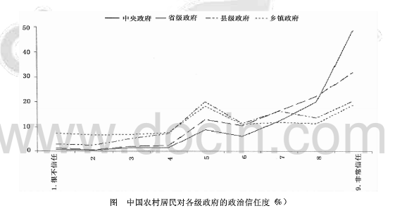 然而,出于研究的实际需要,考虑到中国民众的政治认知程度不是很高,中国场景下的调查研究通常只考察民众对不同层级政府的信任度,很少采取上述如此细致的分类。因此,在此次调查中,我们也仅测量了农村居民对中央政府、省级政府、县级政府和乡镇政府等各级政府的信任度。