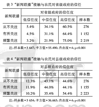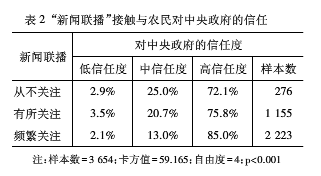 表2显示了在中央政府层面上“新闻联播”接触对农民政治信任度的影响,交叉表的纵项为“政治信任”变量的分类、横项为“新闻联播”变量的类别,统计结果表明,这两个变量间存在正相关关系。在从不关注“新闻联播”的受访者中,高度信任中央政府的比例为72.1%,在对“新闻联播”有所关注的受访者中,高信任度比例为75.8%,而频繁关注“新闻联播”人群中,高信任度比例达到了85%。因此,农村地区居民越频繁关注“新闻联播”,就越对中央政府抱有高度信任感。