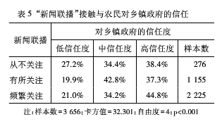表4分析了在县级政府层面上以“新闻联播”为衡量指标的传统媒体与农民政治信任之间的关联,对应“从不关注”“有所关注”和“频繁关注”类别,高度信任县级政府的比例分别为44.6%、44.1%、54.4%。虽然这两个变量没有呈现出表2和表3的明显递增关系,但由于44.6%到44.1%的变化幅度仅为0.5个百分点,而44.1%到54.4%的变化幅度却达到了10.3个百分点,所以正相关关系还是成立的。这一偏差可能说明,“新闻联播”涉及县级政府的内容本来比较少,所以“从不关注”和“有所关注”者获取的县级政府信息差不了多少,从而对县级政府的感性认知影响甚少。但是“频繁关注”者则能从“新闻联播”中获取或解析较多的有关县级政府的正面信息,从而显著增强了他们对县级政府的信任。我们将“从不关注”和“有所关注”两个类别合并后再进行交叉表分析就会避免这种偏差。统计数据分析结果同样支持了在县级政府层面上“新闻联播”接触频次与农民政治信任的正相关关系。