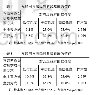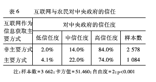 表6显示了在中央政府层面互联网与农民政治信任之间的关系。我们发现,在不以互联网作为信息获取主要方式的人群中,高度信任中央政府的比例为84%,而在以互联网作为信息获取主要方式的人群中该比例为74%。换言之,互联网使用频率与农民对中央政府的信任度呈现出负相关关系,互联网的使用降低了农民对中央政府的信任。
