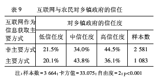 最后,我们在乡镇政府层面上也发现了互联网与农民政治信任之间的这种负相关关系。在表9中可见,以互联网作为信息获取主要方式的人群中高度信任乡镇政府的比例为36.1%,而不以互联网作为信息获取主要方式的人群中此比例则为44.5%。可见,农村居民越依赖互联网获取政治信息,就越有可能会对乡镇政府持不信任态度。