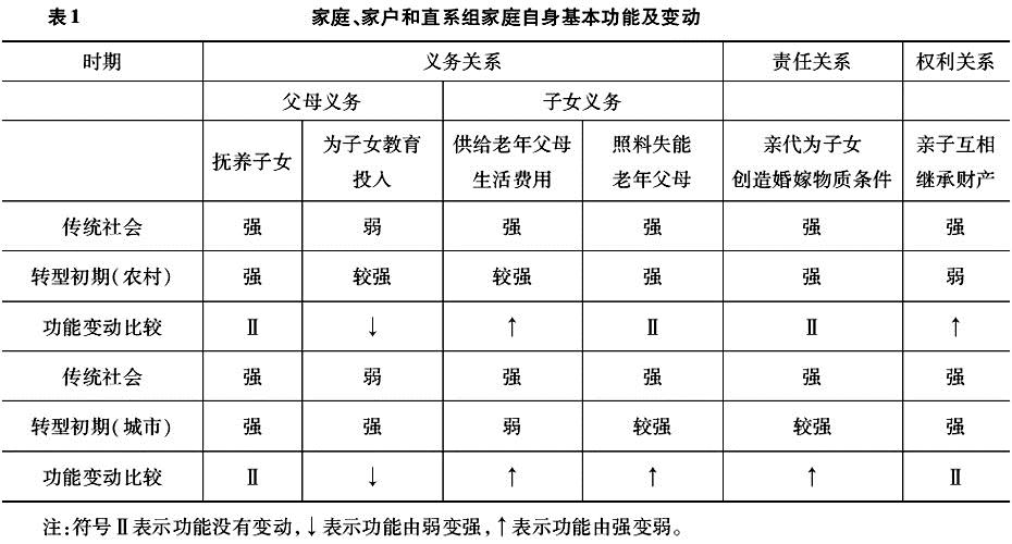 从代际角度看,家庭、家户和直系组家庭的自身功能有较多关联,可以将其概括如表1。