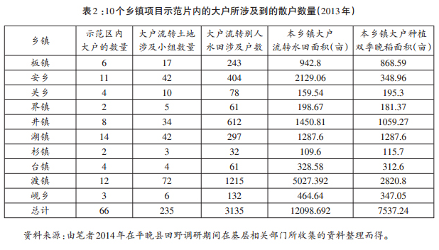 第一层机制就是通过政府干预把散户的土地流转给大户之后,地方政府运作项目时打交道的对象大规模减少,进而导致项目示范区内各个农户的双季稻面积的测量、生产过程的监控、生产进度的统一协调、耕作方式的统一、项目资金的拨付等治理成本都大幅度降低。交易对象的减少,通过表2可以清晰地呈现这一问题。表2最有趣的地方在于:为什么“制造大户”可以降低治理成本,即降低与散户的交易费用。
