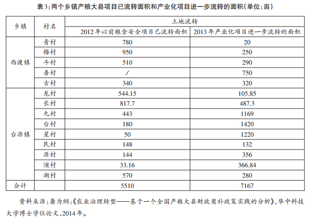 以平晚县的西渡镇和台源镇为例,表3显示,2009年—2012年间,平晚县政府为实施粮食安全项目已经流转了5510亩耕地,在这两个乡镇持续推动耕地流转,形成了很多种粮大户。