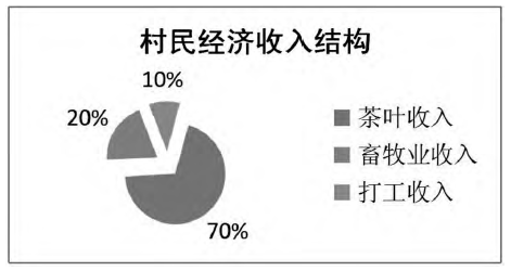 茶叶是伍家台村的传统产业,也是该村村民在当前经济生活中所依赖的支柱产业。全村现有茶园面积约3800亩,人均1.8亩。伍家台村村民的经济收入主要来自于茶叶生产、畜牧业生产和打工经济收入,各经济成分收入占比如下图1所示。