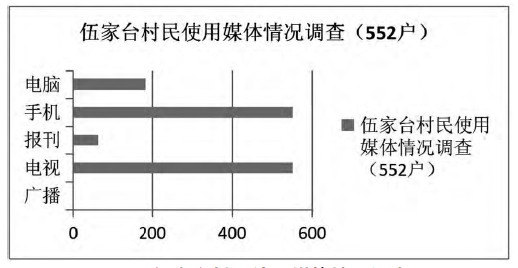 伍家台村民能接触到的媒体形式主要有报纸、电视、户外广告(标语)、电脑和手机等。其中除户外广告这种传播形式外,其他可由用户自主选择接收的媒体当前在伍家台村基本上都具备可传播的条件(广播除外)。当前全村552户村民获取信息所使用媒体情况如下图所示。