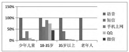 语音是村民间、村民与亲朋间联系的主要方式。虽然35岁以下年轻人能轻松掌握编发短信技能,但由于35岁以上的村民更愿意选择语音这种较为简单的交流方式,因此语音通信依旧是农村信息交流沟通的主要方式,短信交流主要在年岁较小的成年人之间使用,少年儿童与年轻父母间联系偶尔使用。在调查中我们发现,有85%以上的常住村民仍然选择使用功能简单的传统手机,用手机使用微信、QQ等新型媒体类型的生活方式在农村常住人口中并未得到广泛普及,使用人群主要集中在外出打工的青少年人群。