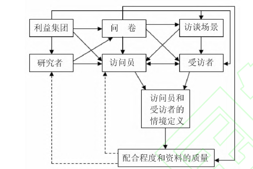 但事实上,“访谈场域”中不只存在研究过程对受访者的影响效应。“访谈场域”是由研究者、问卷、访问员、受访者、访谈场景、利益集团六个主体直接构成的,六个主体在该场域中进行着复杂的相互作用。第一,研究者围绕研究目标设计问卷,将研究目标具体化并融入问卷之中,通过问卷构建出访问员与受访者互动的结构性前提:访问员与受访者的互动,必须依据和围绕问卷来展开,双方“目的性交谈”的目标是要测量研究对象的属性、收集资料。第二,问卷的特征直接影响着受访者、访问员和访谈场景。问卷对受访者的影响是人们所熟知的。比如,问卷内容和长度、问题的顺序、问题的难度(是否容易理解,是否需经长时间思考、回忆和复杂计算方能回答)等,都将影响受访者的合作意愿。问卷对访问员和访谈场景所产生的作用较少引起人们的关注。然而,由于访问员是直接负责资料收集的一线工作人员,是问卷的直接使用人,不考虑问卷带给他们的影响,我们是难以设计出高质量的问卷的。所谓的访谈场景,是指访谈进行的场合(如办公室、居民住宅、生产车间等)和其中的利益相关者。问卷的作用主要体现在对利益相关者的影响上。比如,通过党政系统洽谈调查事宜时,乡镇干部、居委会书记等“守门人”常常要求查看问卷内容,有的甚至由于担心受访者的回答对自己不利而要求陪访。这些现象说明问卷对访谈场景存在一定的影响。第三,访问员、访谈场景对受访者产生“访问员效应”和“访谈场景效应”。①学者们对这两类影响已有深入研究,提出了“标准化访谈”、“过程控制”等应对策略。第四,人与人的互动是嵌入具体情境的,访谈场景不同,访问员和受访者的行为也有所不同,特别场景中若有他人在场时两类行动者所受的影响尤为明显;另外,访谈过程中的被访者并非被动客体,他们的参与访谈的能力、配合的态度、话语、神情等极大地影响着访问员的心理和行为。比如,访谈场景中若有第三人在场,访问员需考虑是否或如何让第三人回避,若无法回避,则需想方设法让第三人不要掺和进访谈过程。学者们讨论访谈情境时,往往认为访问员是主体,受访者是客体,认为访问员具有相对于受访者的地位优势。而事实并非如此。受访者的地位优势、参与访谈的能力和意愿,对访问员有明显的反作用。比如,聘请大学生担当访问员,当面对企业高管、政府官员等群体时,访问员处于明显的地位劣势,整个访谈过程很容易被受访者引导和控制:若受访者的理解能力、记忆能力、计算能力、表达能力很强且愿意配合,访问员能够轻松地、快速地完成访谈,他们会感到愉悦,调查的积极性也高;若遇到不耐烦的、暴躁的、脏话连篇的、中途拒访或甚至直接将访问员拒之门外的受访者时,访问员通常非常气馁,有明显的挫折感,非常容易疲劳,调查积极性不高,甚至害怕入户。第五,研究者、问卷、访问员、受访者、访谈场景五个主体都会受到相关利益集团的影响。比如,2009年全国和谐家庭建设调查的问卷中有多达48个诱导性问题。调查组织者对此的解释是,他们辛辛苦苦开展了和谐家庭建设活动,当然不愿让调查得出不利于我们的结果。该解释说明,利益集团对问卷调查有明显的制约和影响。