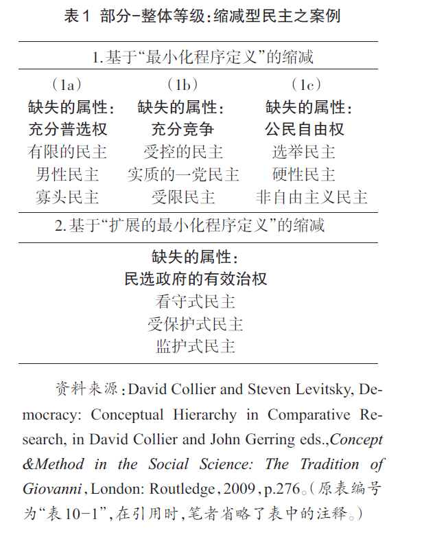 这方面的概念创新经历了一个发展的过程。粗略而言,从1993年的“家族相似性(familyresemblancecategories)”与“辐射型范式(radialcategories)”,经1997年的“缩减亚类型(diminishedsubtype)”,发展到2009年的“部分-整体等级(part-wholehierarchies)”。贯穿这一持续努力的目标是,建构一种作为原型的民主理想类型与它的“缩减亚类型”,为在民主前面添加形容词的实践提供一个自觉的、系统的逻辑分类依据。