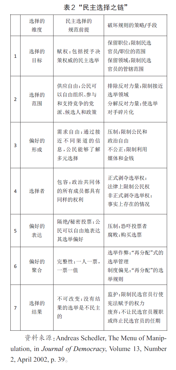 在谢德勒看来,区分选举民主与选举威权的这一标准链具有两个优点:第一,缩小了民主概念的二分法与程度主义之间的距离;对介于民主与威权之间的模糊地带的区分,既考虑到了程度主义的差别,又考虑到了质变的飞跃。第二,连贯的民主之链这一观念,为选举政体的具化比较(contextualizedcomparisons)打开了一条通道。在这种比较中,人们可以辨析出威权政体所操纵的选举在何处/哪个环节破坏了自由和公平的选举。不难看出,谢德勒设置的这些标准有着强烈的现实品格(破坏民主选择规范的各种现象,都是第三波民主化过程中出现的经验事实)。