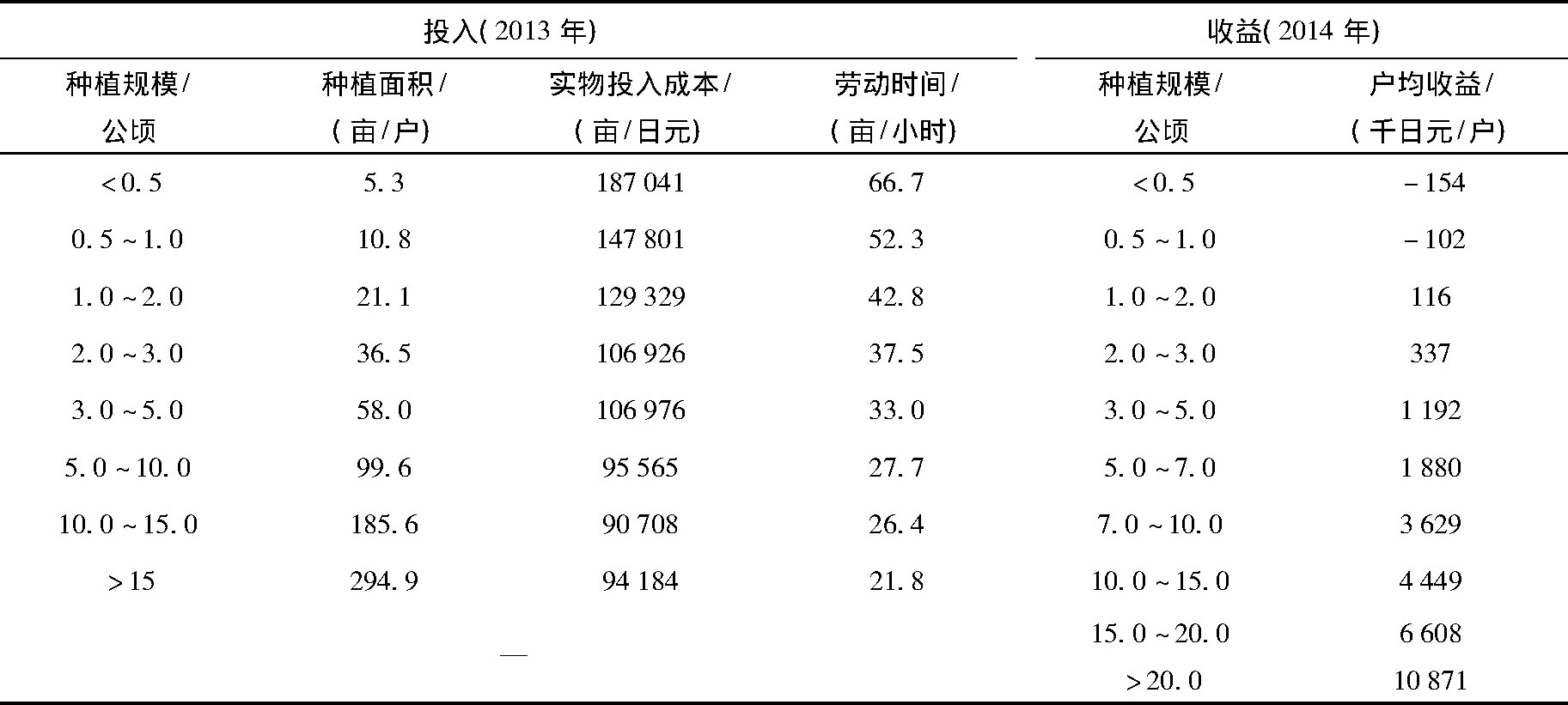 表1 日本不同规模农户水稻种植单位面积的投入及收益对比