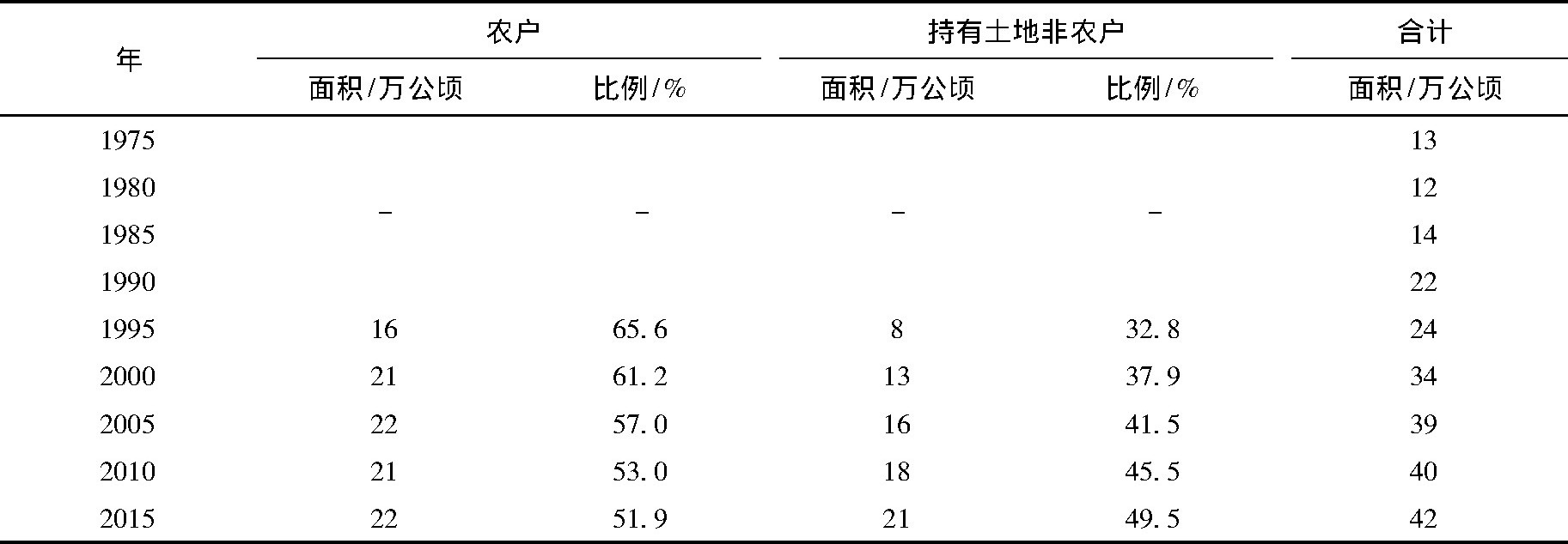 其次,撂荒地的增加以及荒废耕地导致耕地资源减少,有必要提高土地利用率。1975年至2015年的40年间,日本撂荒地的面积从13万公顷增加到了42万公顷,是当初的3.23倍。与此同时,在1995至2015年的20年间,来自非农户持有土地的撂荒地面积持续增长,从8万公顷增至21万公顷,占撂荒地总面积的比例从32.8%上升至49.5%(表2),成为撂荒地面积增加的主要来源,这从侧面反映出非农户持有土地的流转渠道不畅成为撂荒的一个主要原因。另外,由于“第二种兼业农户往往抱有较高的农地转用期待,他们宁愿放弃耕种与流转,导致耕地撂荒”[6]。