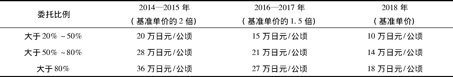 其次,通过实行流转补贴措施,提升参与流转的动力。农地中间管理制度采用的补贴政策称为机构集中合作金(1),针对两个层次三种对象。第一个层次是对区域的补贴,称为区域集中合作金(日语是“地域集積協力金”),作为“区域”的条件包括属于同一市町村范围,并包括在同一个“区域农业总体规划”(2)的范围;作为农业村落或拥有10公顷以上耕地的范围;涵盖多个农户;耕地面积在“耕地台账”中是清楚的等4项。一个区域委托给农地中间管理机构的面积达到20%以上是获得补贴的起点,单位面积的补贴标准随着委托比例的增加而提高。另外,2018年的补贴标准是基准,委托的时间越早,补贴力度越大。