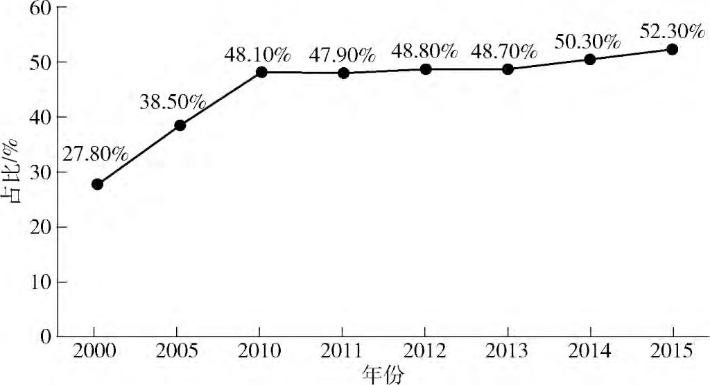 2 户均经营面积是除北海道之外都府县的情况。1960年的数字摘自:农林水产省.日本の農地集積対策について.平城25年7月:1。2014年的数字摘自:平成26年農業構造動態調査結果.電子政府の総合窓口:http:∥www.e-stat.go.jp/SG1/estat/List.do?lid=000001130405。