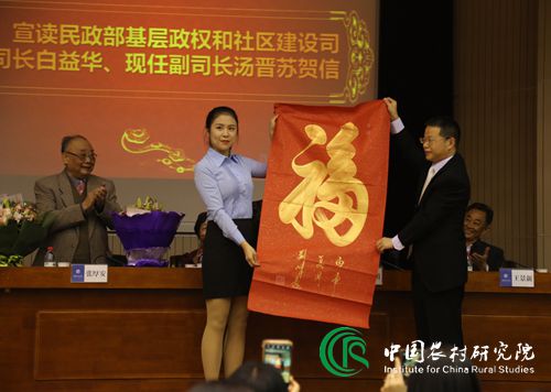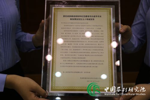 典礼伊始,现场以视频短片的方式回顾了张厚安先生的学术生涯和学术成就。随后,学生代表孔浩博士宣读了民政部基层政权和社会建设司原司长白益华、现任副司长汤晋苏的贺信,并献贺礼。白益华司长、汤晋苏副司长向张厚安先生送上了衷心的祝愿,汤副司长称赞张厚安先生是“走向乡土大地的学者”,并送给张老先生“福”字贺礼。